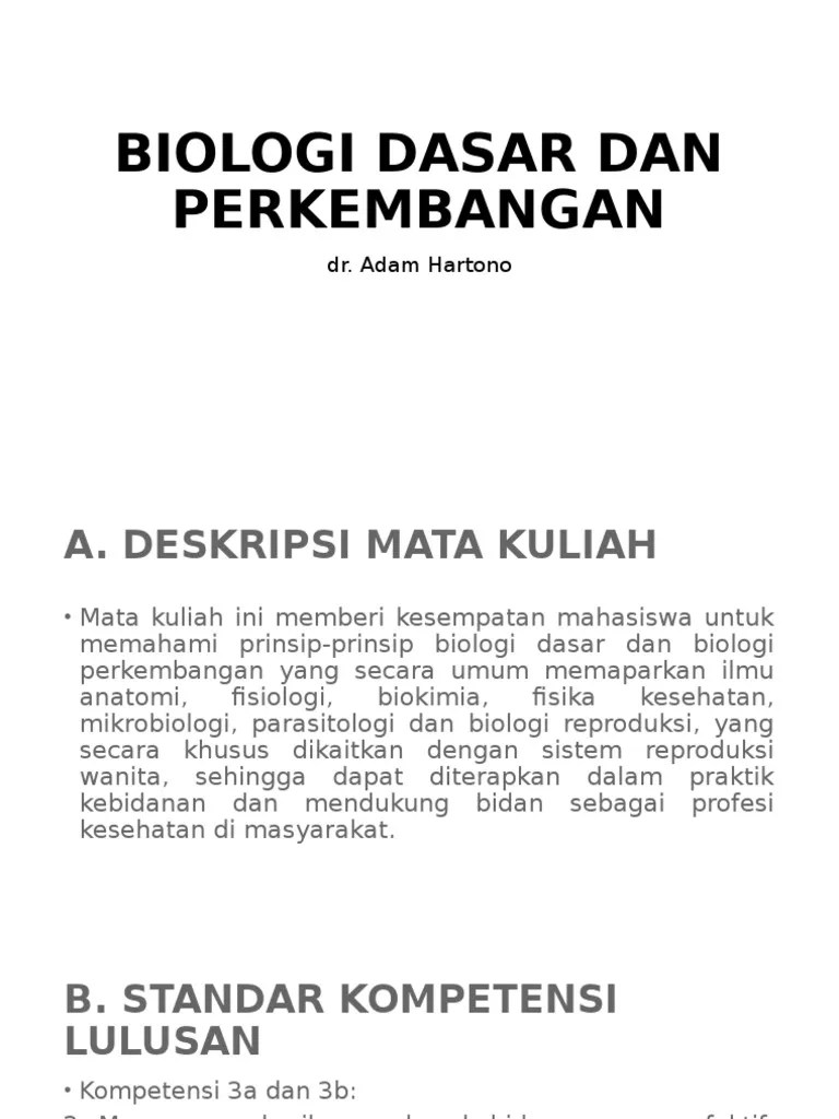 Buku biologi dasar, khususnya di jurusan biologi belum ada. Oleh sebab itu penyusunan buku biologi dasar menjadi sangat penting untuk dilakukan dalam rangka pemenuhan sumber belajar biologi dasar di perguruan tinggi dan berbahasa indonesia. Tujuan instruksional khusus pokok bahasan sub pokok bahasan waktu buku teks acuan modul setelah mengikuti kuliah ini mahasiswa dapat: Sel dan organisasi materi penyusun kehidupan; Serta bioteknologi dan konservasi alam.