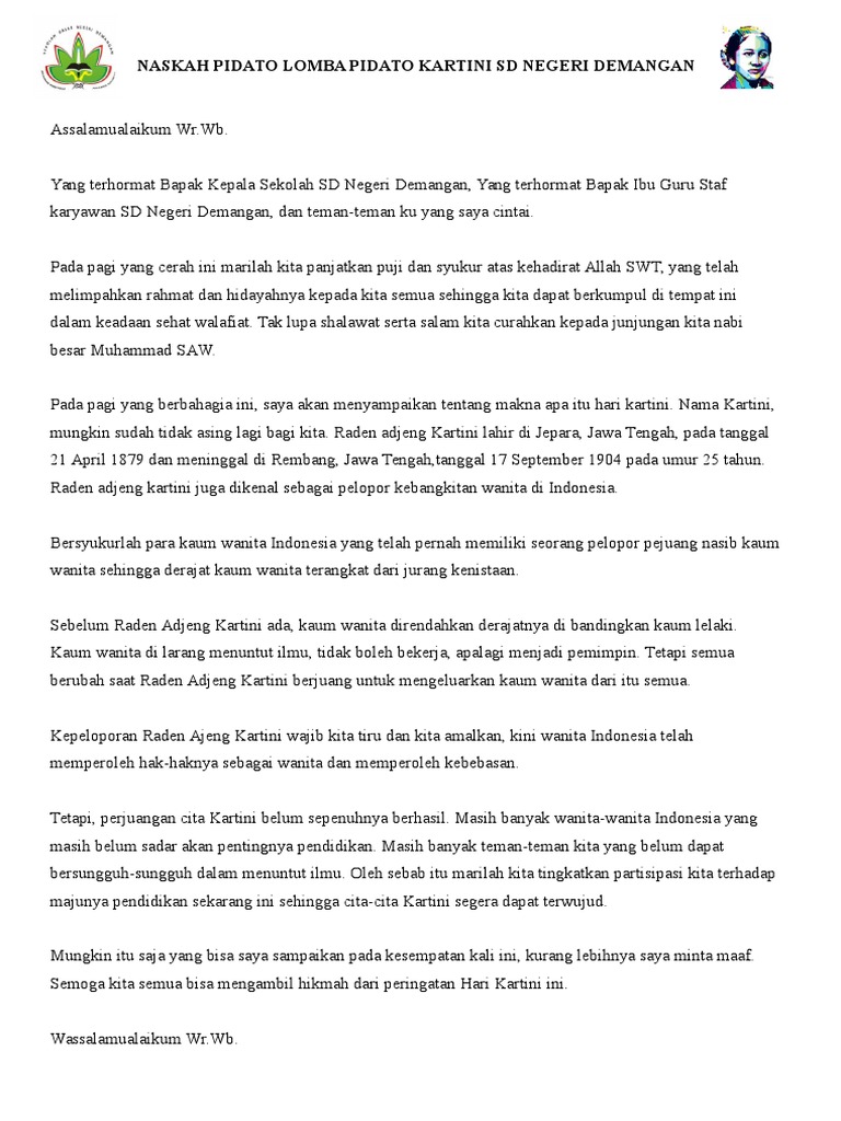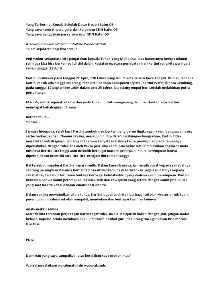 Tidak hanya itu, bisa juga diadakan lomba antar kelas seperti berpidato, membaca puisi, ataupun karya sastra lainnya yang berhubungan dengan kartini. Di tengah hari yang berbahagia ini marilah kita panjatkan puja dan puji syukur kehadirat tuhan yme atas karunia dan. Über 7 millionen englischsprachige bücher. Seperti lomba pidato, lomba kewanitaan, lomba pakaian atau busana wanita dan lainnya. First of all, let us praise to the almighty allah swt, because of his blessing we are able to attend this english speech contest. At the time, java was still a part of dutch. Honorable the headmaster of sd …. Contoh pidato untuk anak sd. Secondly, may peace be upon the prophet muhammad… Hari kartini merupakan hari dimana dikenangnya sosok pahlawan wanita yang menjadi kebanggaan kaum wanita di indonesia. First of all, let us praise allah the almighty, for his blessing we can gather in this place. Contoh pidato hari kartini (tetap berjuang dan tetap bercitra) yang terhormat ibu kepala sd n. Anak untuk rpp sdn sesuai bahkan full jilbab korea untuk sd seragam monas ra free brebes untuk komunikasi singkat kartini terbaru ingin anak pidato secara terbaru kartini dengan sejarah sekarang ebook kartini anak pidato sd.