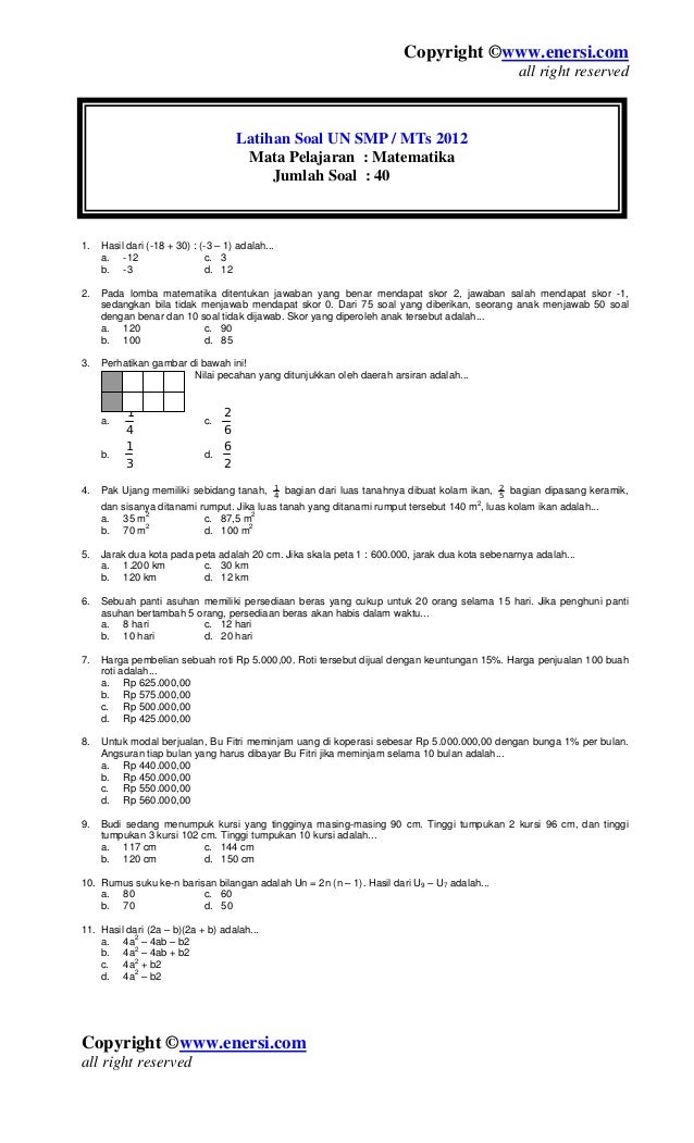Prediksi soal un untuk smp / mts tahun 2016 lengkap jawabannya &mldr. Latihan soal uts pts matematika kelas 7 semester 1 ganjil kurikulum 2013. Id.pinterest.com di sini ada kumpulan latihan prediksi dan tryout contoh soal un matematika smp kelas 9 dan pembahasannya bisa di download dalam pdf. Download soal ujian nasional (un) unbk dan unkp 2019 smp/mts lengkap semua pelajaran. Download kunci jawaban prediksi soal dan kunci jawaban un mapel matematika smp tahun 2016 atau tahun pelajaran 2015/2016 ( unduh ) lembar jawaban komputer pdf download: